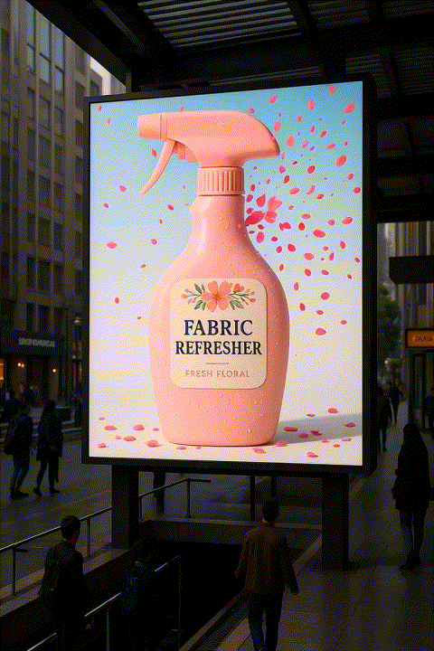 사용 프롬프트: 이른 아침 도시 지하철 역사 입구 클로즈업, 입구 상단 대형 3D 디지털 스크린에 사진 속 섬유탈취제와 분홍색 꽃잎이 보인다, 실제 공간에는 출근객이 지나다닌다, 산뜻하고 활기찬 무드, 부드러운 새벽 햇살, 고해상도 상업 광고 스타일