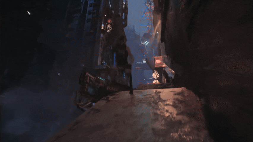 A futuristic parkour athlete in sleek Jedi-inspired techwear performing a gravity-defying jump across a deep chasm in a Coruscant-like neon-lit cyberpunk city. Massive starships fly in the background between towering skyscrapers. Cinematic lighting with orange and teal hues, glowing neon signs reflecting on wet surfaces.
