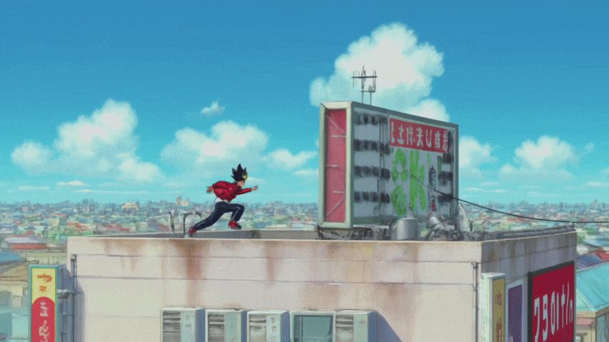 High-octane anime style scene of a young protagonist with spiky hair performing parkour over a vibrant Japanese city. The character runs along power lines and leaps over colorful billboards. Studio Ghibli meets modern Shonen aesthetic, lush blue sky, white cumulus clouds.