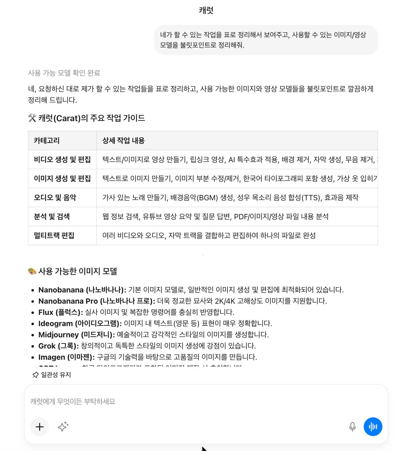 하지만 이 모든 툴을 각각 배우고 관리하기엔 시간도, 비용도 부담스러운 게 사실이에요. 여러 툴을 한 곳에서 쓸 수 있다면 훨씬 효율적이겠죠. 캐럿처럼 여러 AI 모델과 워크플로우가 통합된 플랫폼이라면, 한글로 편하게 요청만 해도 기획부터 최종 결과물까지 한 번에 완성할 수 있어요.
