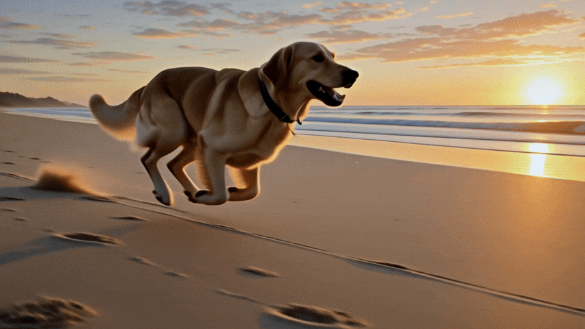 (노을 지는 해변을 뛰는 골든 리트리버, 따뜻한 오렌지빛 조명, 영화 같은 슬로우 모션, 뒤에서 따라가는 카메라)