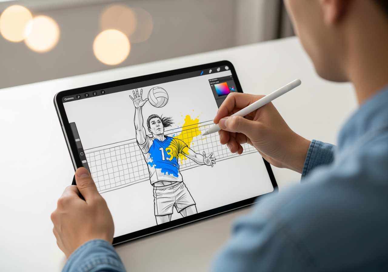 Digitalkünstler bearbeitet eine Volleyballspieler-Skizze auf einem Tablet und fügt dem Trikot Farbe hinzu