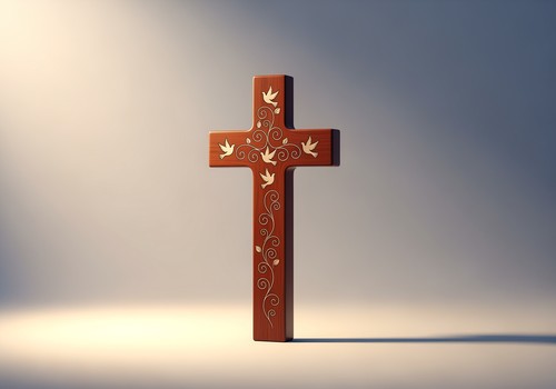 Beschreiben Sie die Merkmale des gewünschten Kreuzes (z. B. keltische Knoten, Rosendekorationen, Holztextur) detailliert per Text.