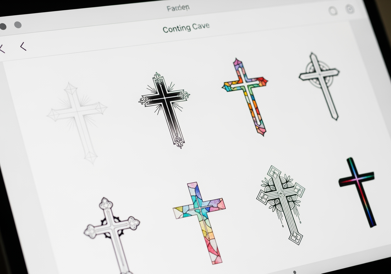 Kreuz-Zeichnungen sind ein beliebtes Motiv über religiöse Symbole hinaus und werden häufig im Tattoo-Design, in der Gothic-Mode, bei Schmuckskizzen und auf Albumcovern verwendet. KI ermöglicht es Kreativen, komplexe Muster und Texturen einfach darzustellen.
