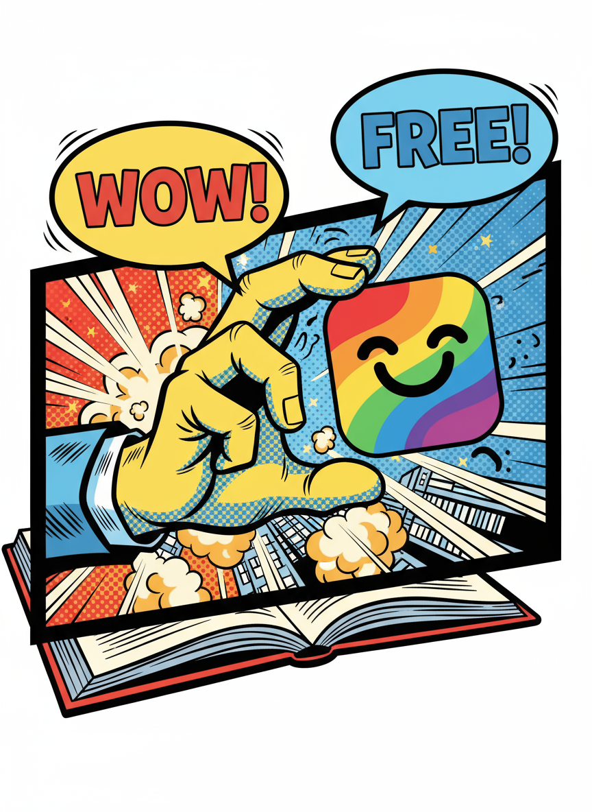 만화책 칸에서 튀어나온 손이 떠다니는 컬러풀한 일러스트 아이콘을 잡는 장난스러운 팝아트 일러스트, "와우!"와 "무료!" 말풍선.
