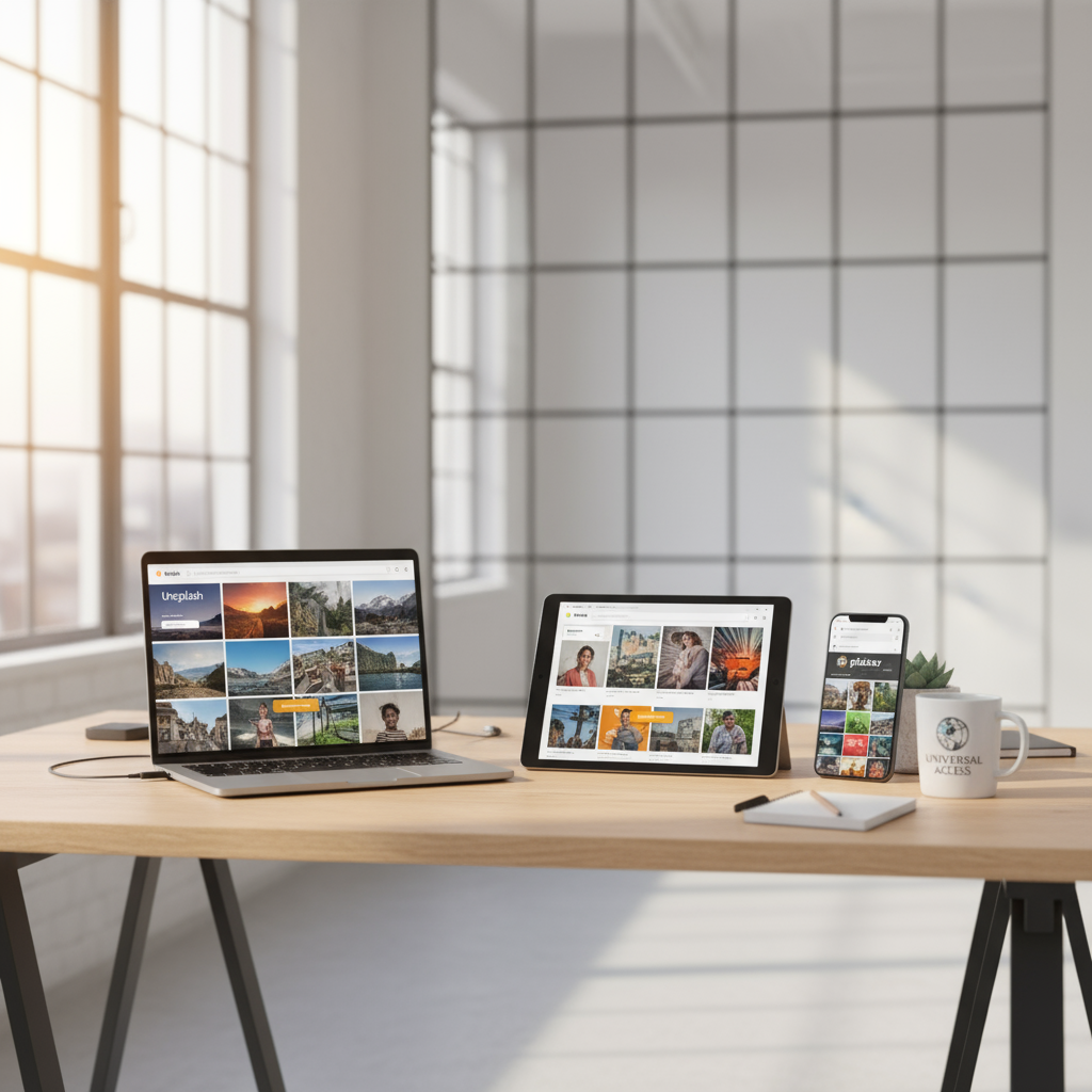 다양한 기기(노트북, 태블릿, 스마트폰)가 고품질 무료 이미지 다운로드 웹사이트를 표시하고 있는 현대적이고 햇살 가득한 창의적인 작업 공간, 보편적인 접근성과 편의성을 강조, 밝은 스튜디오 사진.