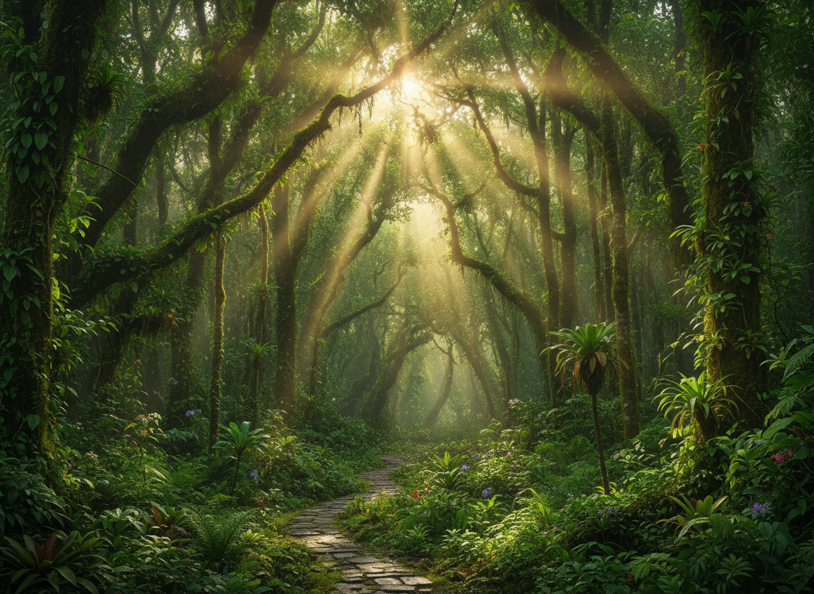 빽빽한 우림의 캐노피를 뚫고 들어오는 햇살, 울창한 초록빛이 가득한 초고해상도 바탕화면.