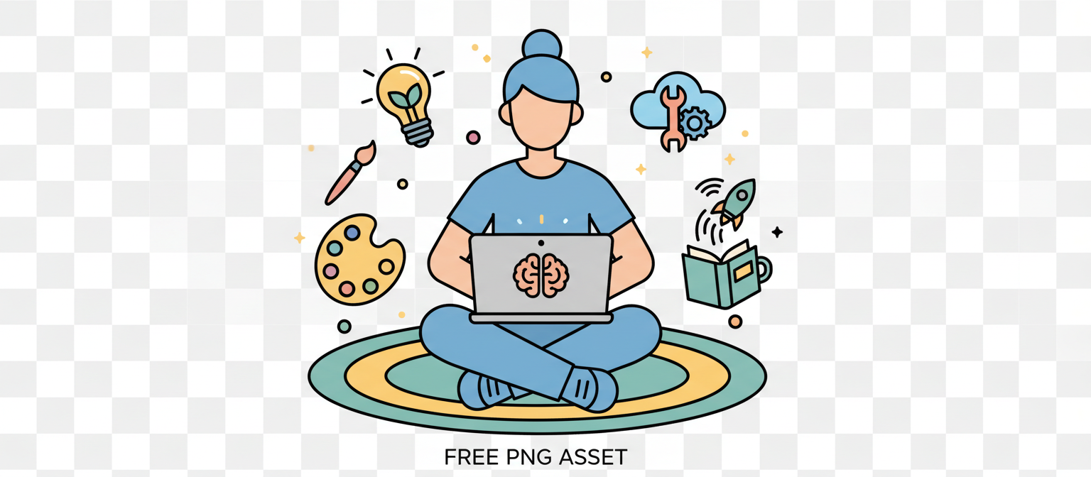 노트북으로 작업하는 사람의 플랫 디자인 벡터 일러스트레이션, 창의적인 작업 공간, 투명 배경, 무료 PNG 에셋.
