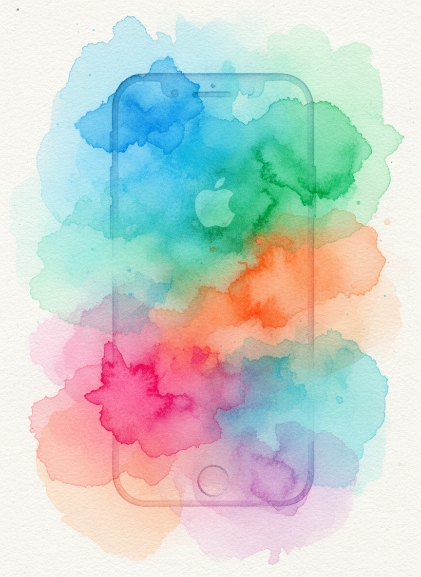 생동감 넘치는 수채화 물감 스플래시와 함께 공중에 떠 있는 아이폰 목업.