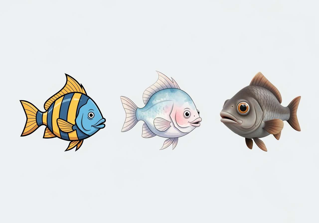 Implement cartoon fish in your desired art style through over 30 AI models, including vector art, watercolor, and 3D rendering.