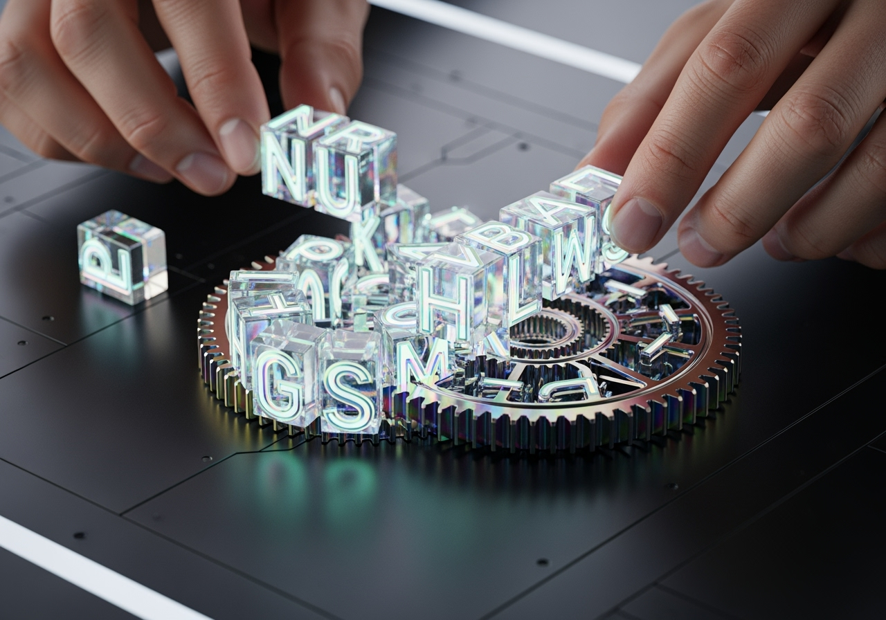 A close-up of hands arranging glowing letters that are transforming into a detailed, photorealistic mechanical gear, representing precision.