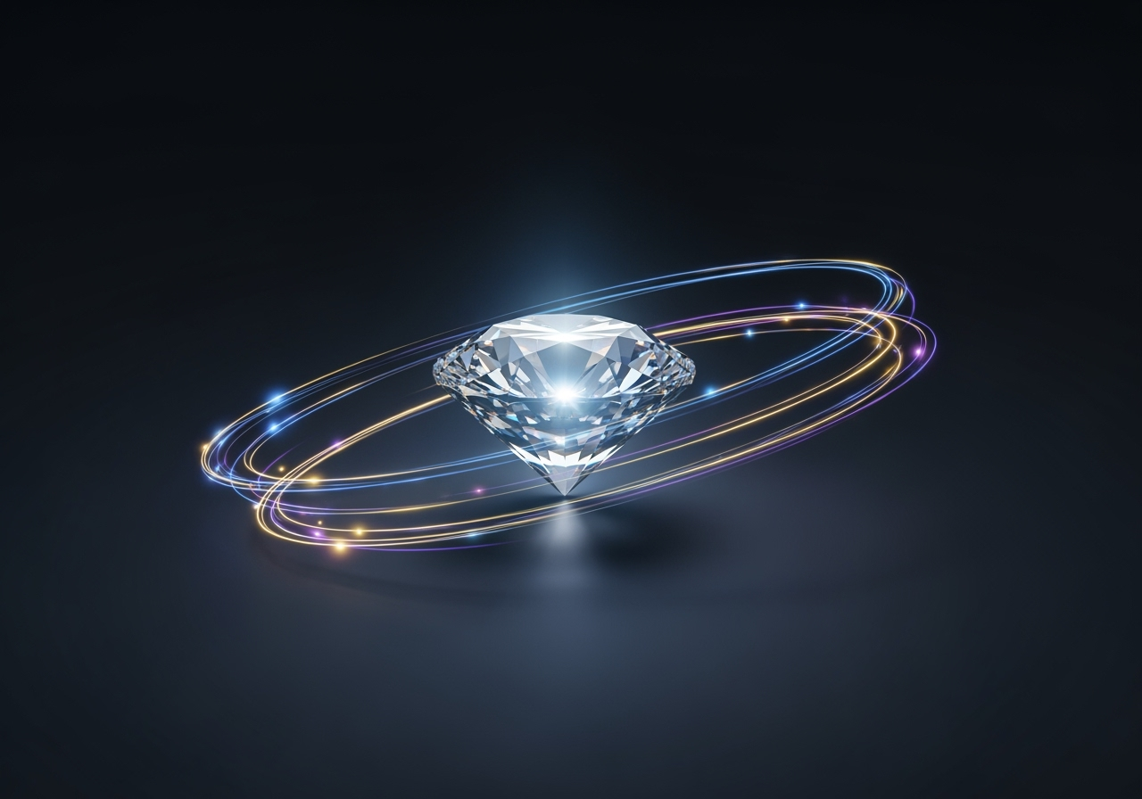 A glowing multifaceted diamond symbolizing AI creativity, with light trails orbiting it on a dark background.
