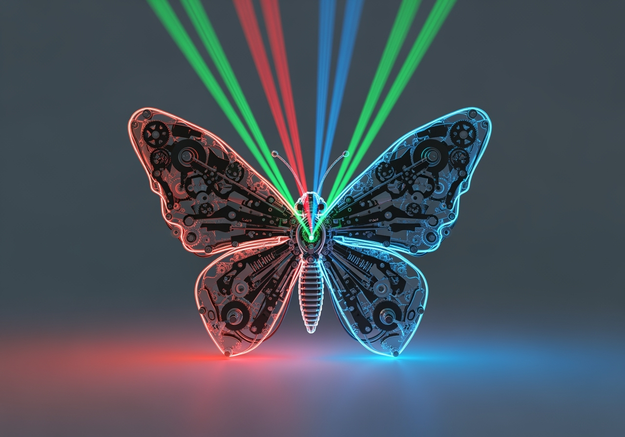 Three light streams merging into a detailed image of a butterfly, symbolizing multi-prompting and quality in AI generation.