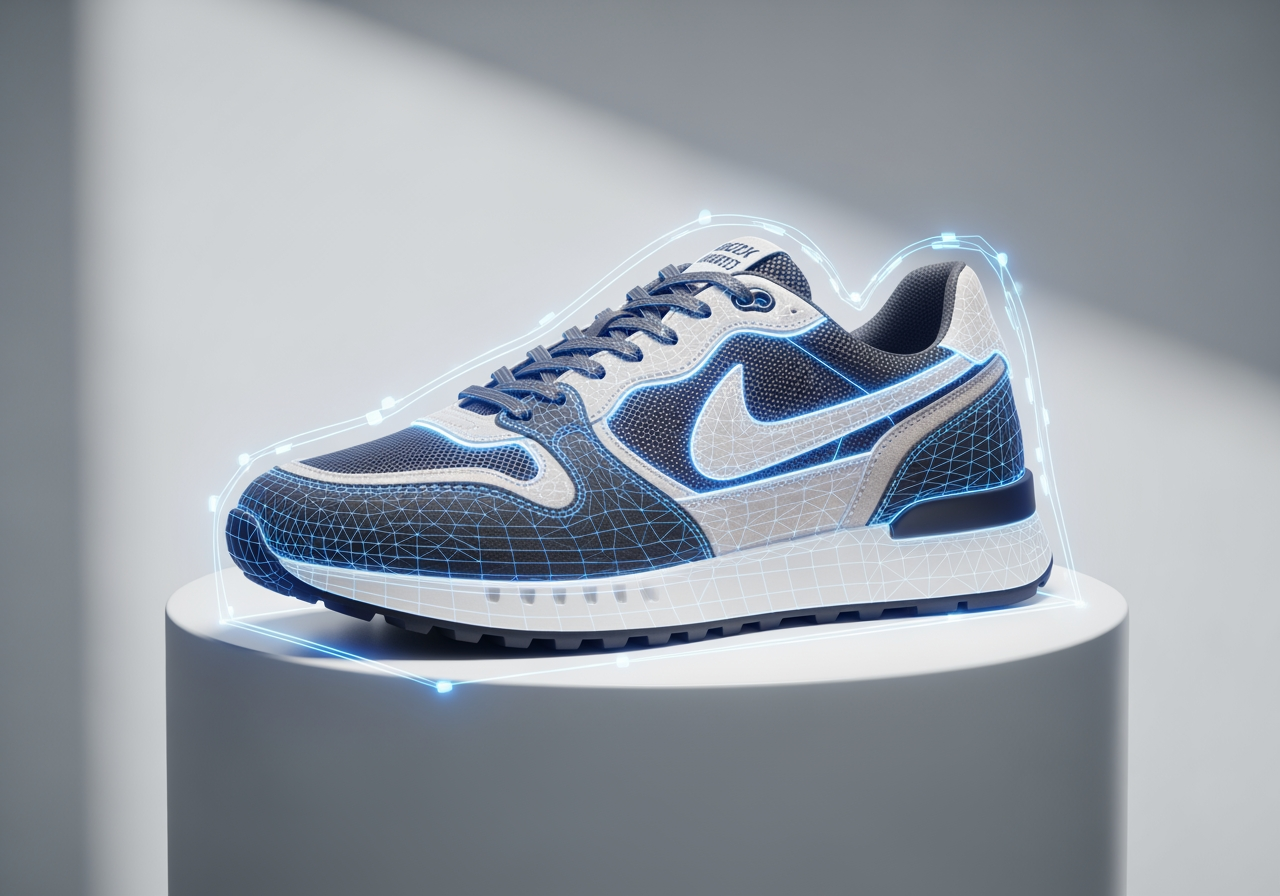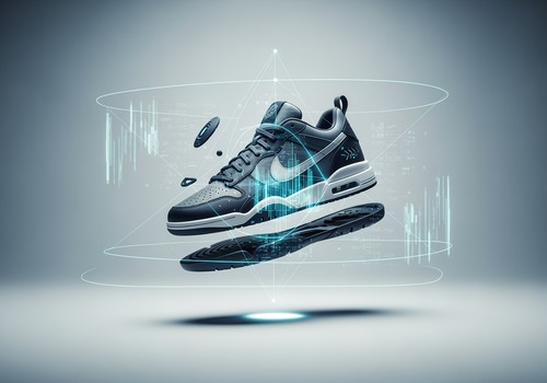 IA analizando el estilo y estructura de una zapatilla de moda flotando en el aire