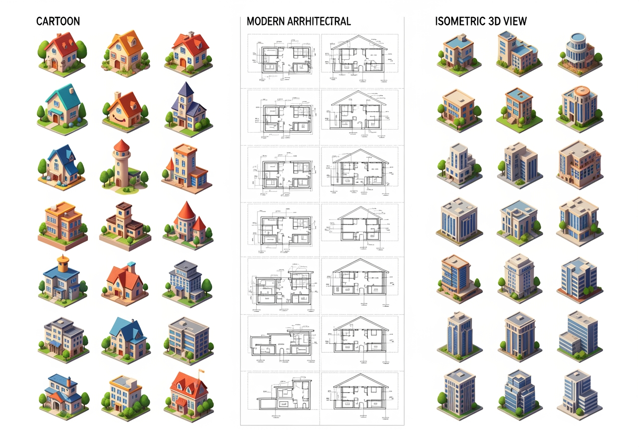 Crea iconos e imágenes de edificios fáciles de entender para materiales de aprendizaje infantil o presentaciones de arquitectura.