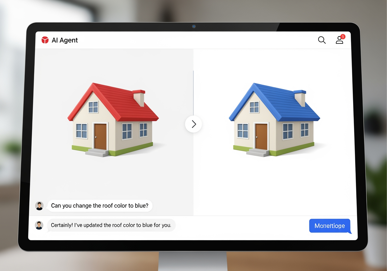 ¿No estás satisfecho con la imagen generada? Simplemente di 'Cambia el color del techo a azul' en el chat, y el agente de IA lo editará al instante.