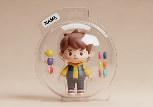 For an authentic collectible look, add phrases like "in blister pack packaging," "in original box," or "with collector's coin" to your prompt.