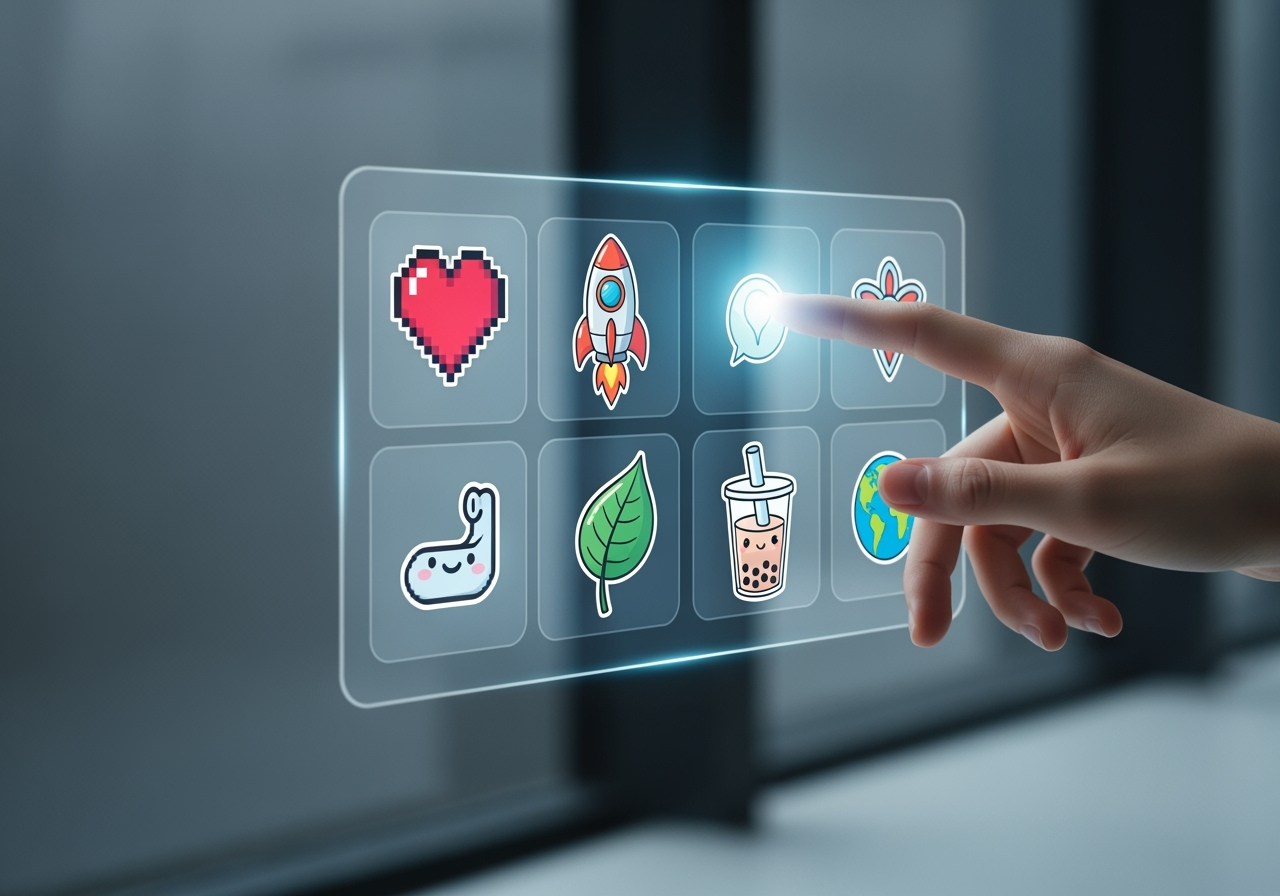 A person selecting a favorite sticker from a grid of AI-generated options on a futuristic interface.