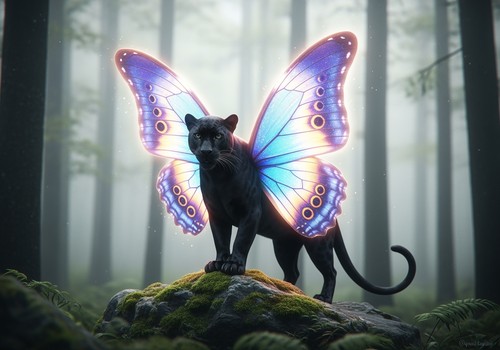 A majestic black panther with vibrant glowing butterfly wings, representing an imaginative AI-generated animal.