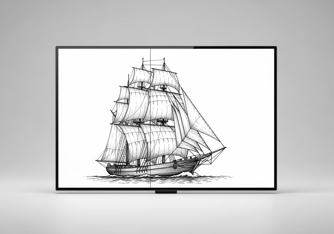 Generatore di Disegni di Barche con IA: Disegno di barca in fase di scaling a risoluzione 4K.