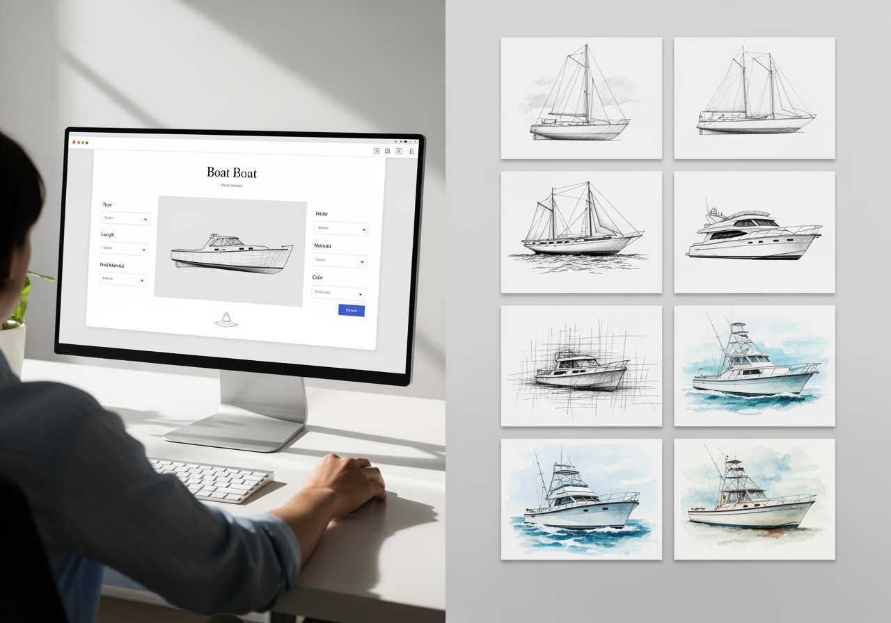 Generatore di Disegni di Barche con IA: Diversi stili artistici di disegni di barche e interfaccia IA.