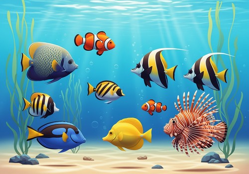 Crea immagini colorate della vita marina che catturano l'attenzione dei bambini per migliorare la qualità dei materiali didattici o dei fogli di lavoro.