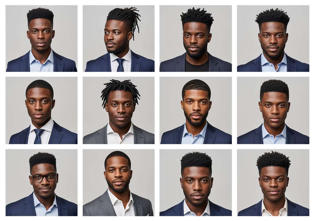 Gere imagens de homens negros com texturas de pele e iluminação requintadas, indistinguíveis de fotos reais.