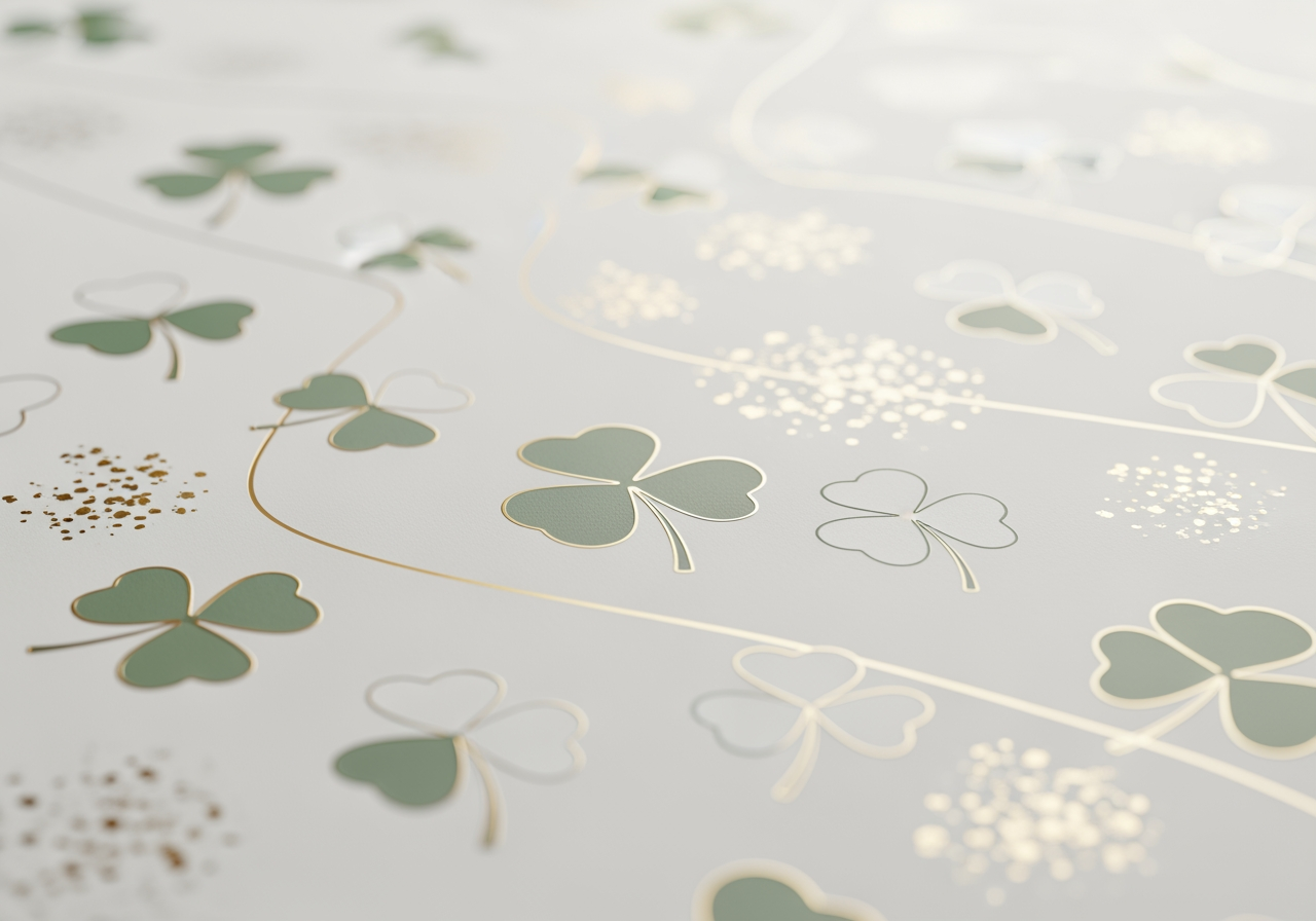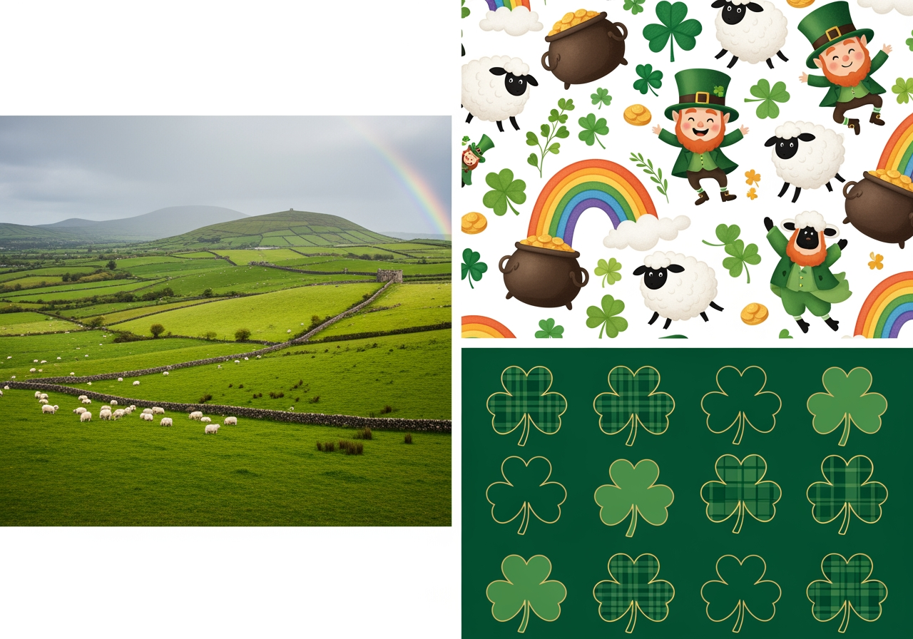 Instrua a IA inserindo texto que descreva o clima desejado, a paleta de cores e os objetos principais (trevos, chapéus, etc.).