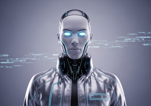 身穿银色夹克、拥有霓虹蓝眼睛的未来派 AI 代理肖像