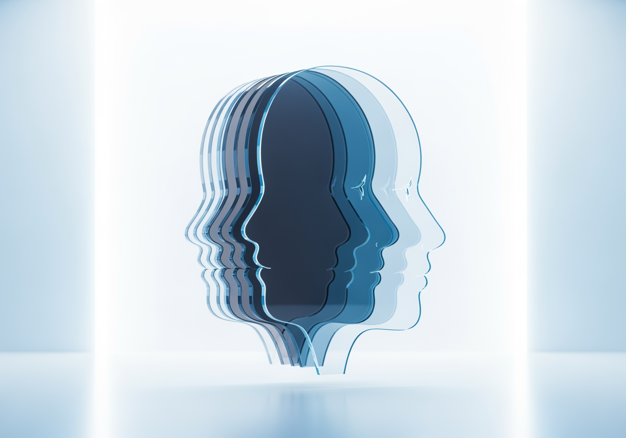 形成代表 AI 模型多样性的数字面孔的各种半透明层