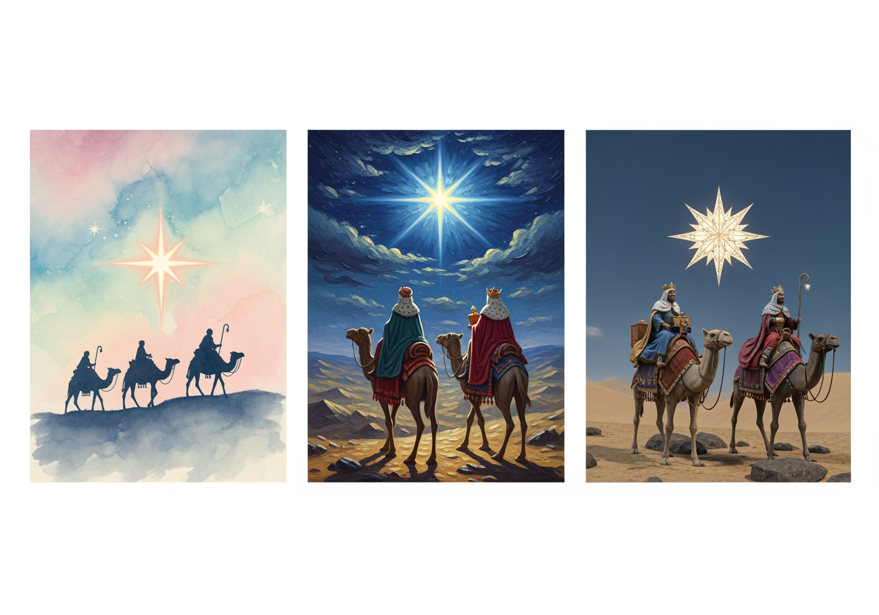 使用水彩、油画、3D渲染等30多种AI模型,以各种风格表现三王节的图像。